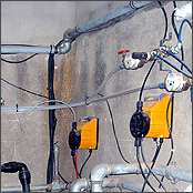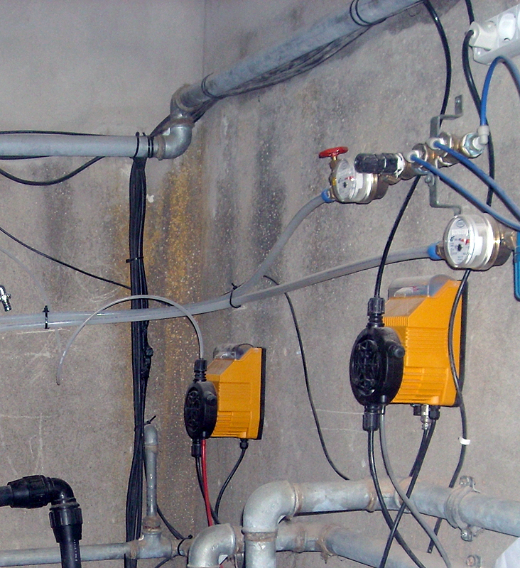 Cuando se parte de un agua de pozo hay que desinfectarla antes de cualquier otro tratamiento. Ello se consigue con la dosificación proporcional de cloro en un depósito donde debe estar en contacto un mínimo de 30 minutos para ser efectivo. El cloro es un bactericida que rompe la membrana celular. La dosificación se realiza con bombas de membrana que se pueden regular de varias maneras según la instalación.